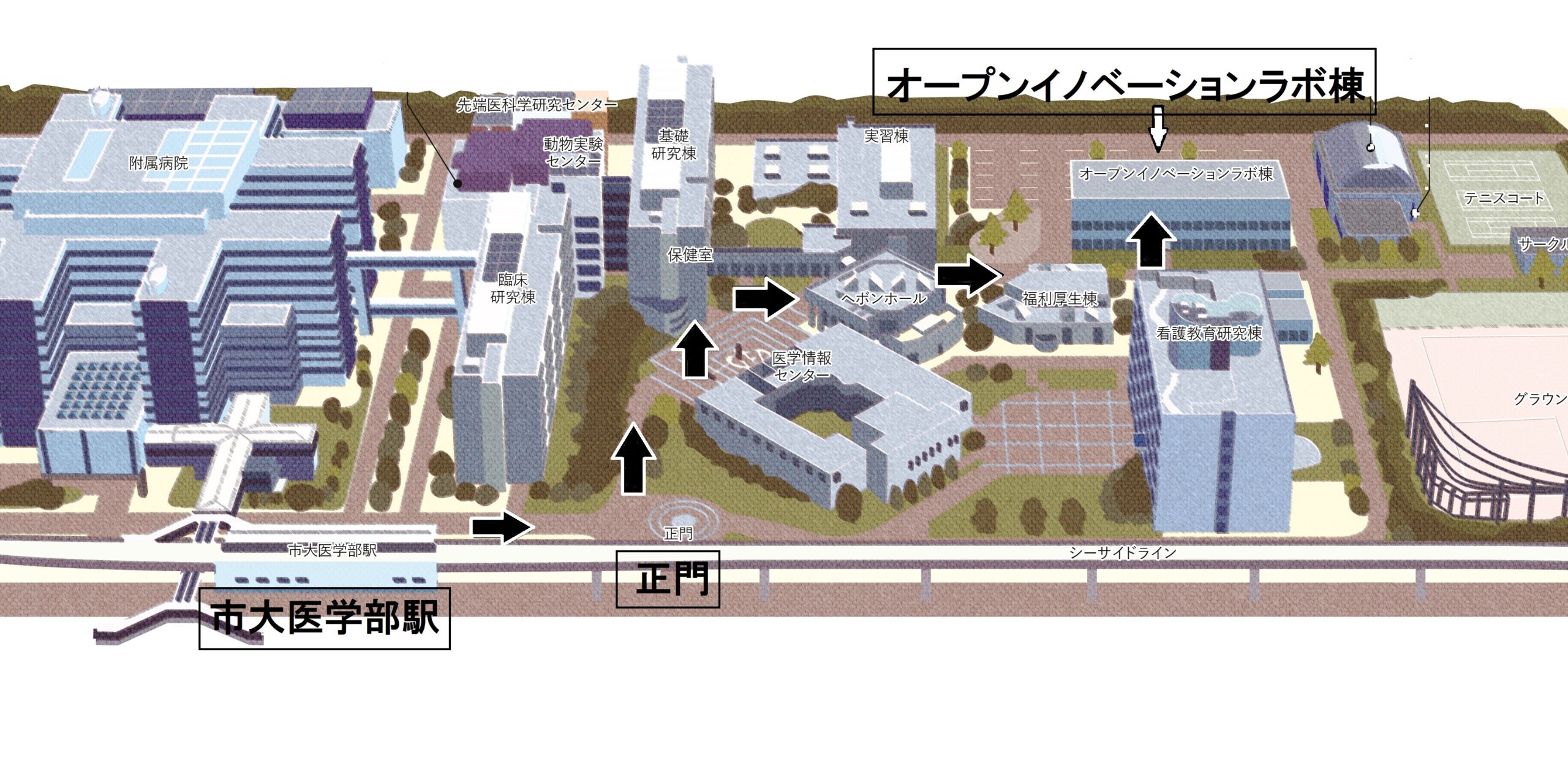 会場(オープンイノベーションラボ棟)はシーサイドライン市大医学部駅から横浜市立大学福浦キャンパス正門を通って徒歩10分程度です。駐車場はありません。