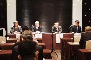 神奈川政経懇話会は15日、「2026年の動向を読む」と題してシンポジウム(12月定例講演会)を横浜市中区のロイヤルホールヨコハマで開催した=写真。パネリストとして共同通信社の倉本義孝政治部長、加藤裕経済部長、井上智太郎外信部長が登壇。神奈川新聞社の鈴木達也論説主幹がコーディネーターを務め、26年について「米価の下落」「令和の選挙改革元年」「G2(米中2大国)の力の外交の時代」と解説した。